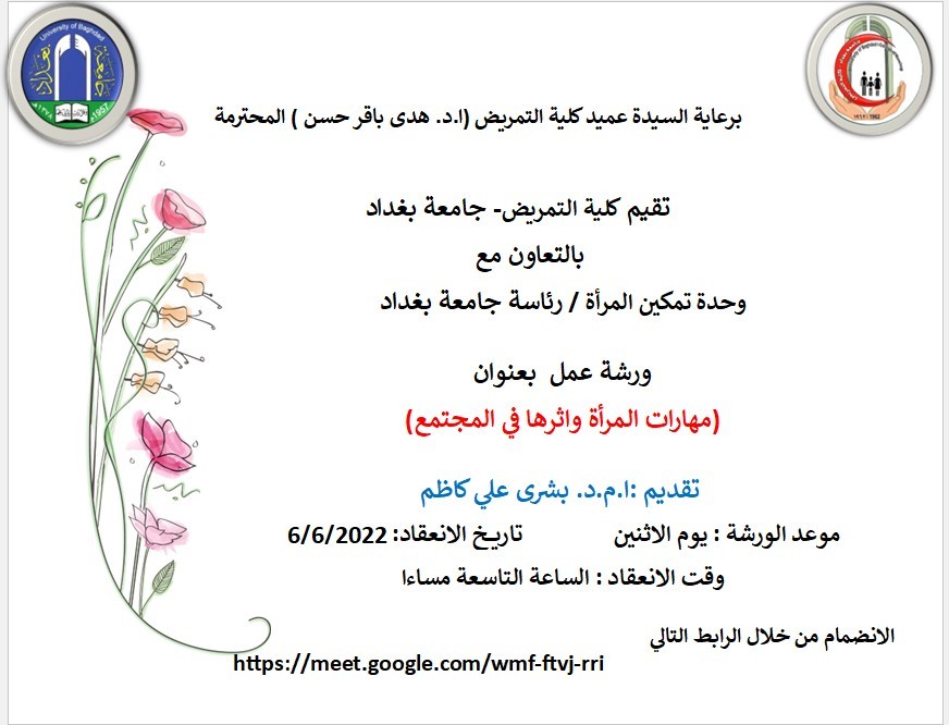 The College of Nursing at Baghdad University organized a workshop entitled “Women’s Skills and Impact in Society” on the virtual platform Google meeting and in the presence of a number of teachers and students of primary and higher studies.