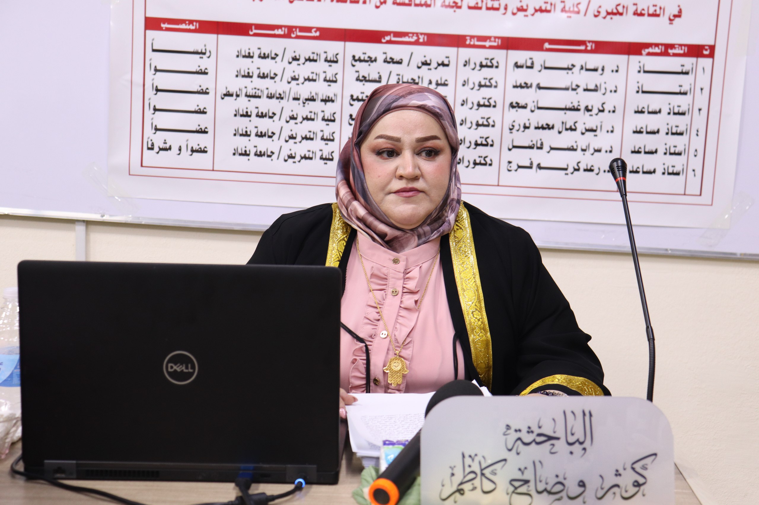 The college of Nursing at Baghdad University discussed the doctoral thesis entitled “The effectiveness of an educational program in improving parents’ management of their children with hemophilia” by Kawthar Wadah Kazim, under the supervision of Assistant Professor Dr. Raad Karim Faraj, in the college’s Great Hall.