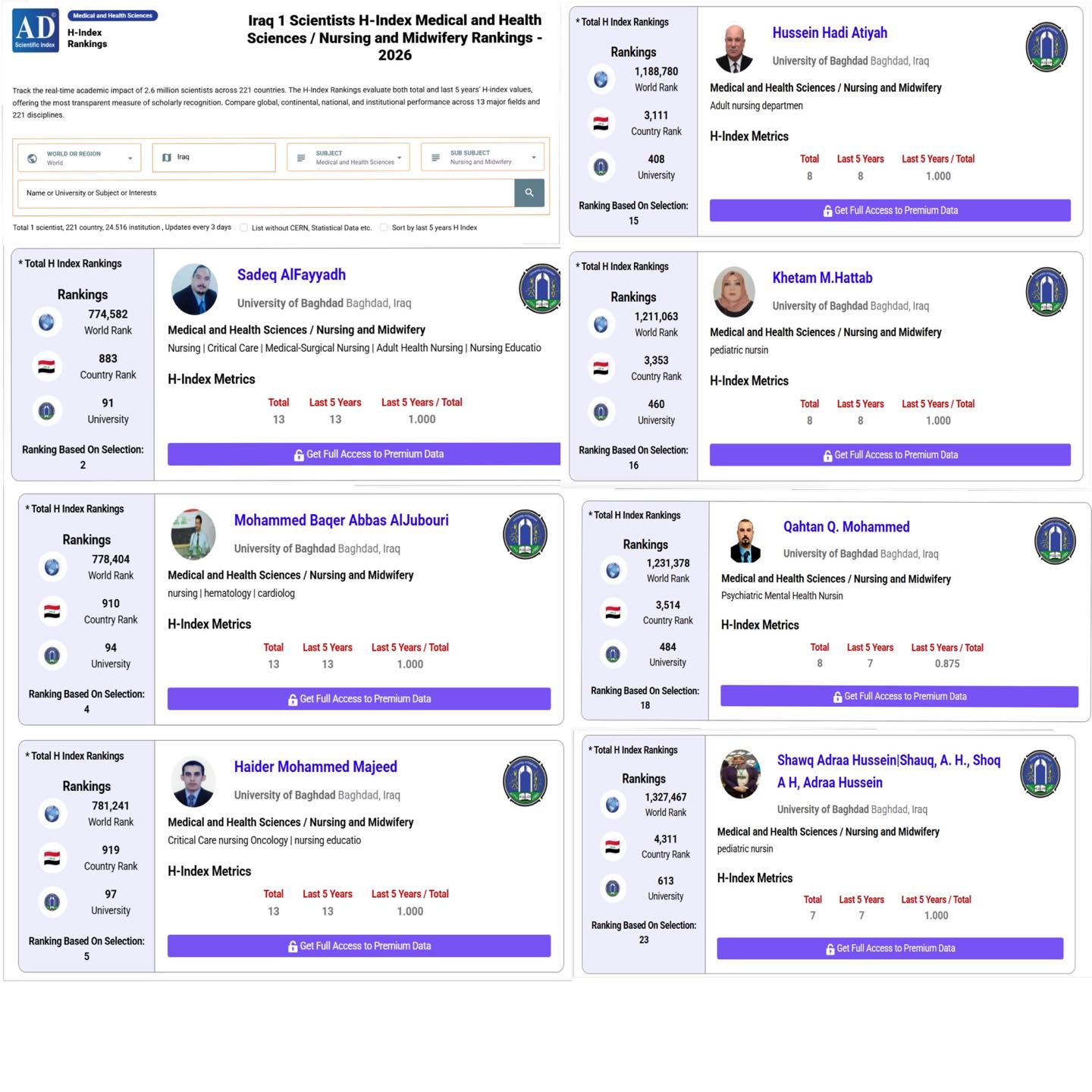 AD Global Scientific Index (ADThe college of Nursing at the University of Baghdad achieved a new scientific achievement by a number of its teachers topping the list of the best researchers in Iraq in the specialty of nursing and midwifery, within the classification of the Scientific Index