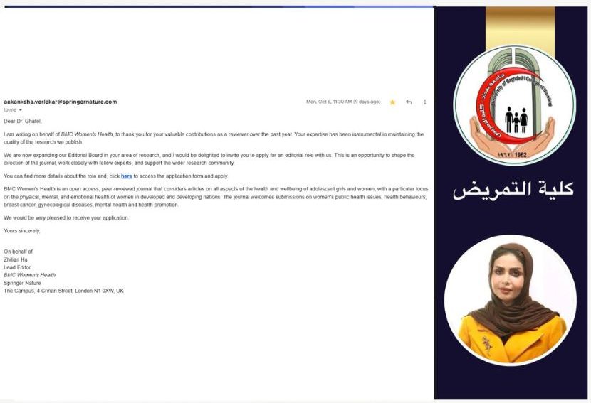 Prof. Dr. Hawraa Hussein Ghafel, who teaches at the College of Nursing at Baghdad University, has received an official invitation to join the editorial board of the peer-reviewed scientific journal BMC Women’s Health.