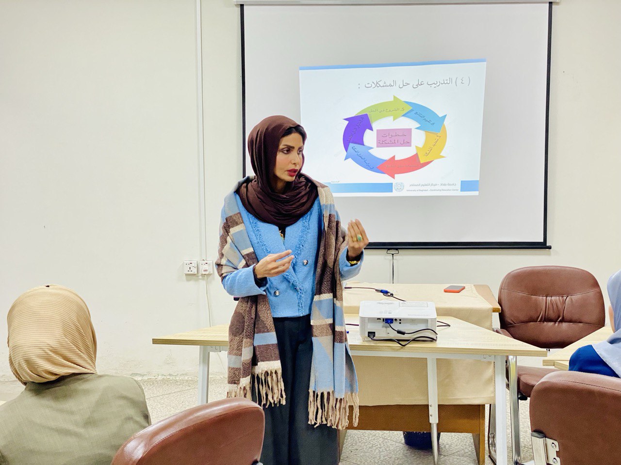The Qualification, Employment, and Follow-up Unit at the Faculty of Nursing, University of Baghdad, organized a specialized training workshop entitled “Steps to Solving Problems at Work.” The workshop was part of a series of training programs offered by the college to support and empower students and graduates and increase their readiness for the job market. The workshop was presented by Professor Dr. Houra Hussein Ghaffal and attended by a group of students in the college’s leadership hall.