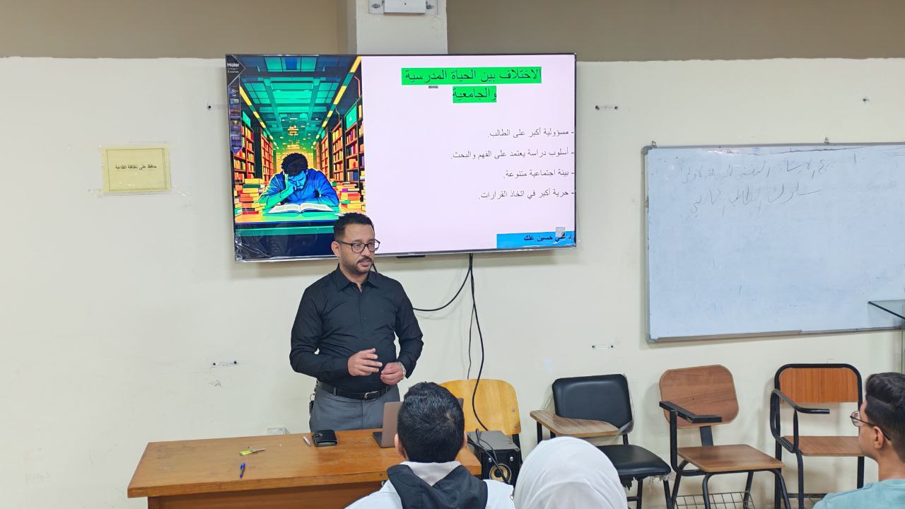 The session addressed the importance of this stage as a turning point in life that requires psychological and academic preparation to adapt to new changes. It covered key topics such as the differences between school and university life, basic adaptation skills, and common challenges such as anxiety and time management. Alk also discussed with students the practical academic skills that must be mastered early on, such as time management, developing study skills, and building a social network, emphasizing the importance of taking advantage of university services and taking care of physical and mental health. The discussion emphasized the need to contact the Educational and Psychological Counseling Unit confidentially to resolve any psychological, social, or academic issues that students may encounter. Time was allocated for discussion and answering questions, which generated considerable interest in the importance of a successful transition to university life.