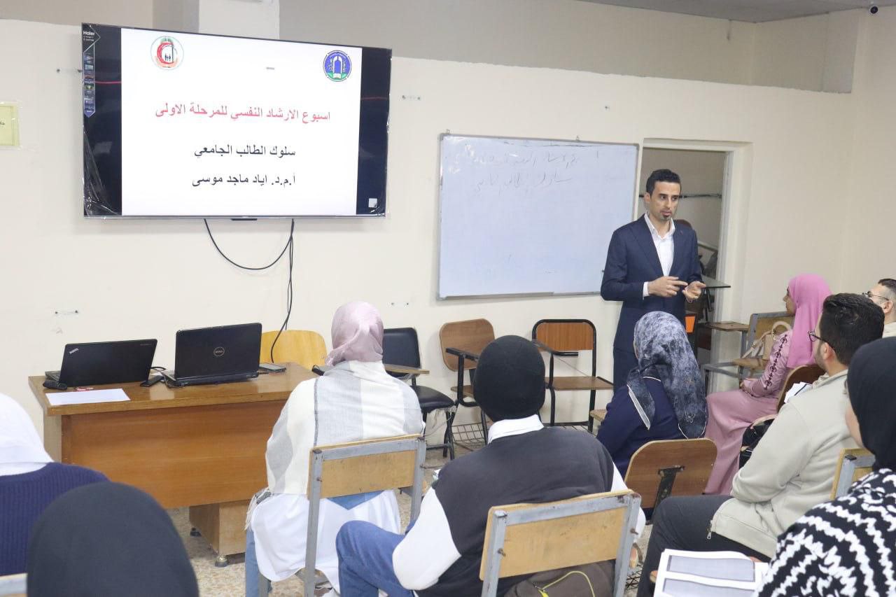 The Psychological Counseling and Educational Guidance Unit organized a specialized awareness workshop for first-year students entitled “University Student Behavior” as part of Psychological Counseling Week. The workshop was presented by Assistant Professor Dr. Iyad Majid Musa, Head of the Nursing Fundamentals Department, and was attended by a group of new students.