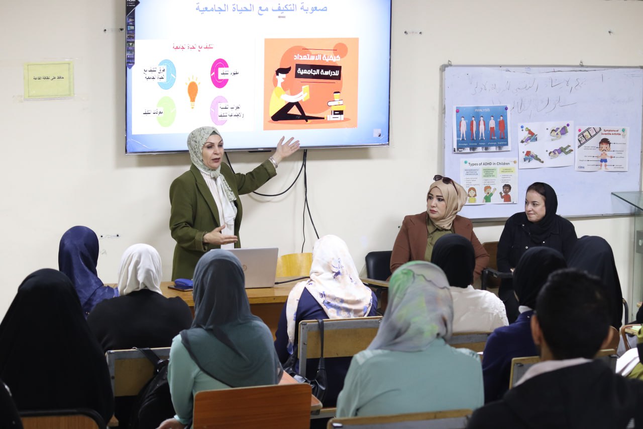 The Psychological Counseling and University Guidance Unit at the Faculty of Nursing, University of Baghdad, organized a specialized awareness workshop entitled “The Most Prominent Challenges Facing University Students,” as part of the Psychological Counseling Week activities for first-year students. It was presented by Assistant Professor Dr. Ibtisam Khalaf Abdul Ali. A large number of new first-year students participated in the workshop.