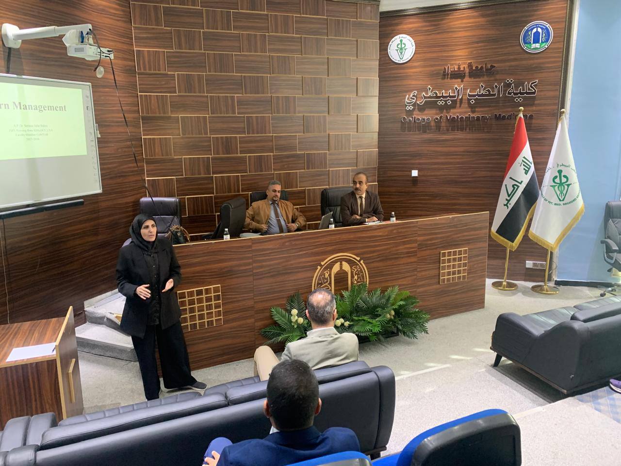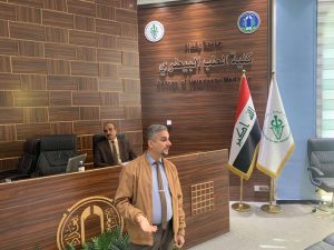 The Rehabilitation, Employment, and Follow-up Unit at the college of Nursing, University of Baghdad, organized a specialized training course entitled “First Aid for Burns and Electric Shocks.” The course was taught by Assistant Professor Dr. Wafa Abdul Ali, Assistant Professor Dr. Sirwan Baqir Jafar, and Lecturer Dr. Basem Muhammad Jawad. It was held in the “Baghdad” hall at the College of Veterinary Medicine at the University of Baghdad, attended by a diverse group of students, faculty, graduates, and professionals working in the field of veterinary medicine