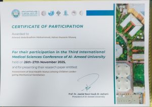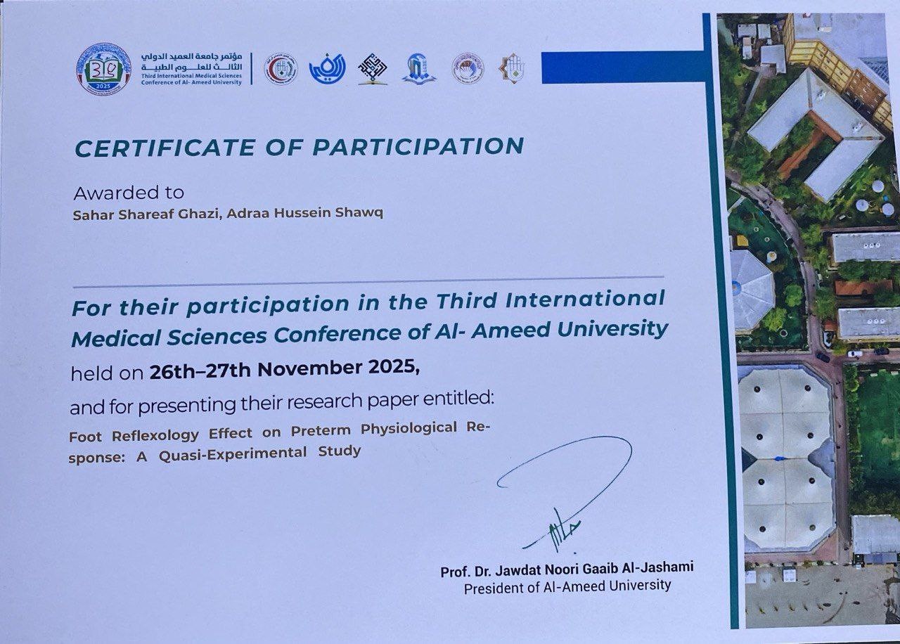 The participation consisted of the presentation of two distinguished research papers drawn from doctoral theses by students Ahmed Abdul-Kazim and Sahar Sharif, under the supervision of Assistant Professor Dr. Azra Hussein Shawq. The research highlighted fundamental issues in the field of childcare, addressing: “The effect of foot massage on the stability of physiological indicators in newborns” and “Assessment of oral health and related factors in children on ventilators.”