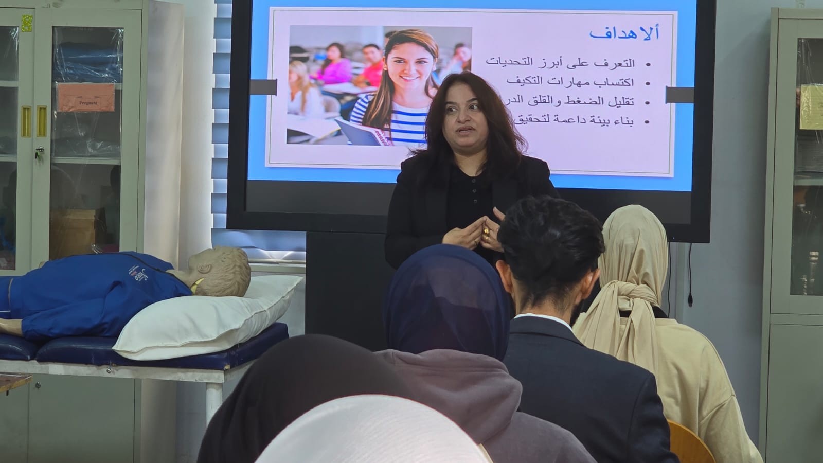 The Women’s Affairs Unit at the Faculty of Nursing, University of Baghdad, organized a discussion panel entitled “Female University Students: Challenges and Capacity Building,” presented by Dr. Intisar Muzaffar Oda in the Skills Laboratory, attended by a group of fourth-year students. The session addressed the university stage as a pivotal turning point in a student’s life, combining scientific training with practical character building. The lecture reviewed the most prominent academic, psychological, economic, and social challenges that students may face from their first year until graduation.