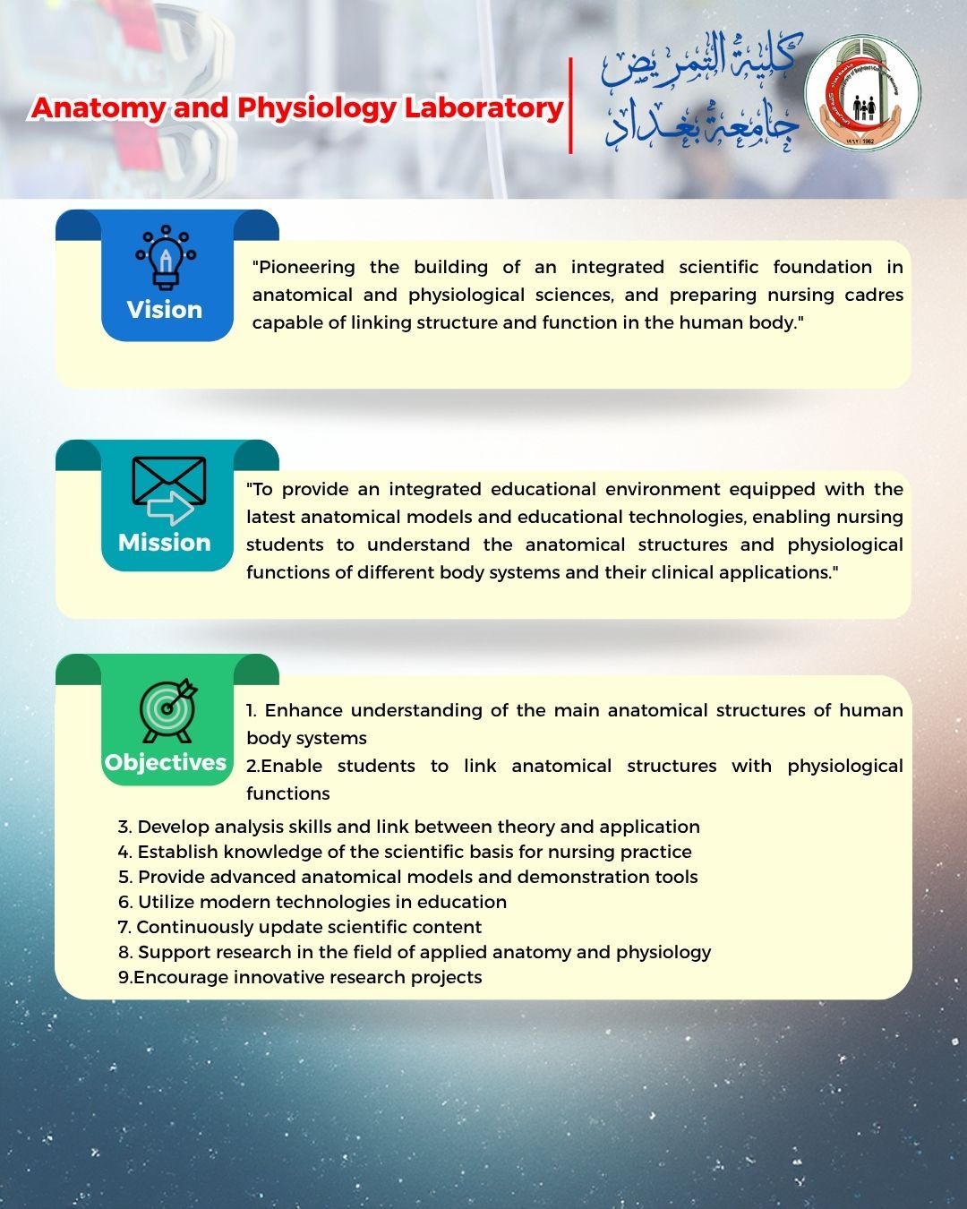 This laboratory is one of the most important laboratories for nursing students, as it helps students understand anatomy and physiology from a scientific perspective, helping them identify the different organs of the body that make up the various systems, in addition to conducting some of the necessary tests related to the work of university nurses in hospitals.