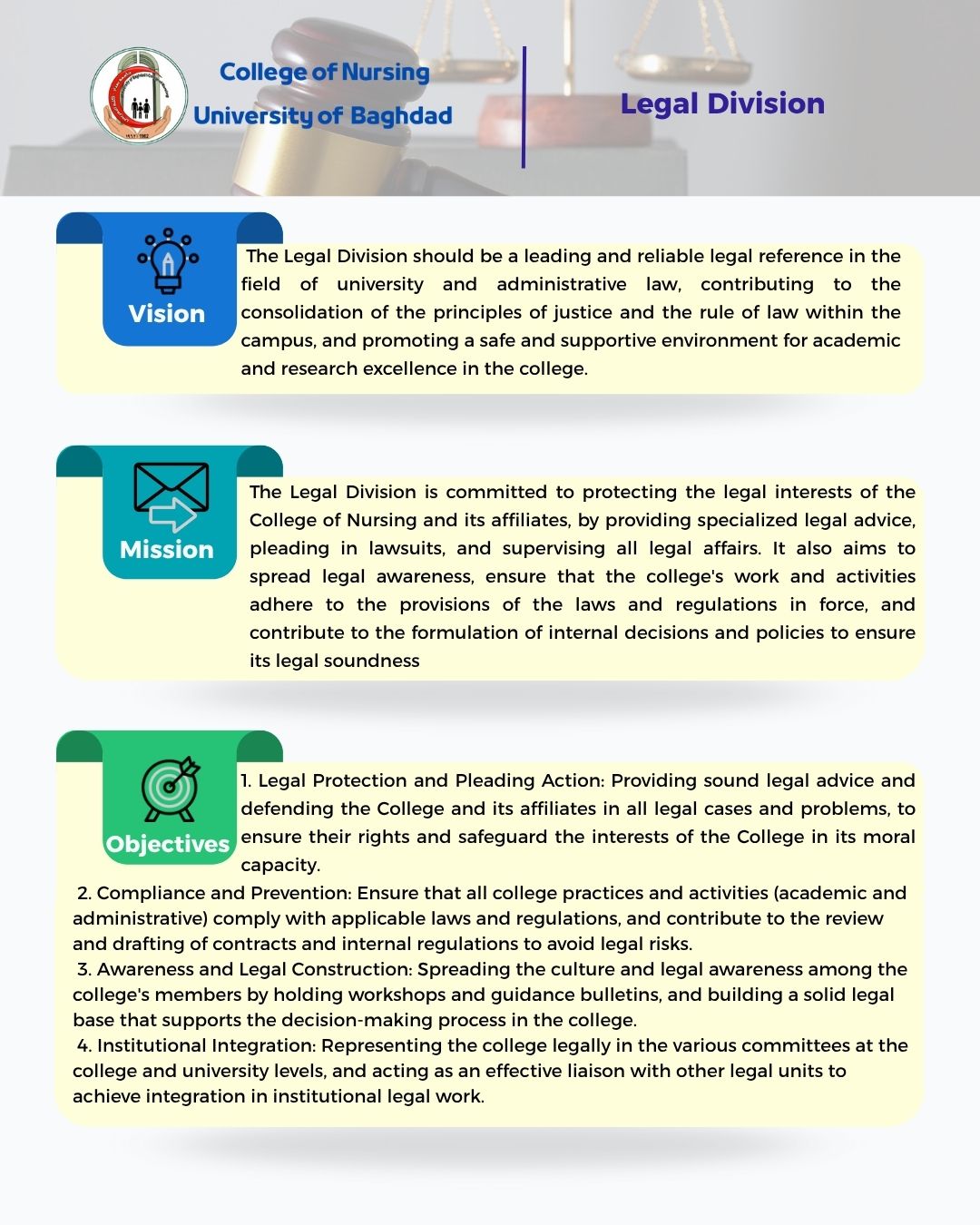 The Legal Division is responsible for supervising all legal work and issues, providing legal advice and litigation in cases in which the College of Nursing in its legal capacity or one of its affiliates is a party, as well as participating in internal committees in the college or even formed at the level of Baghdad University, in which the presence of legal opinion is required.