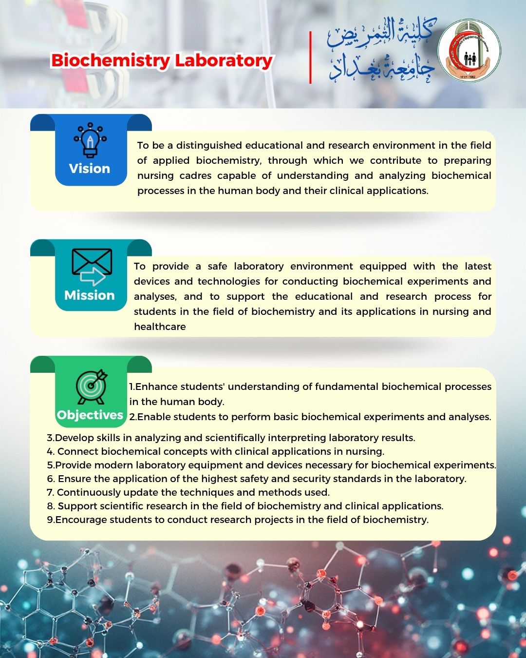 Motivate students to learn about the latest laboratory and therapeutic techniques related to biochemical reactions and to benefit from advanced global scientific practices and discoveries to build a future vision for students to raise the standard of healthcare to the highest levels of service.