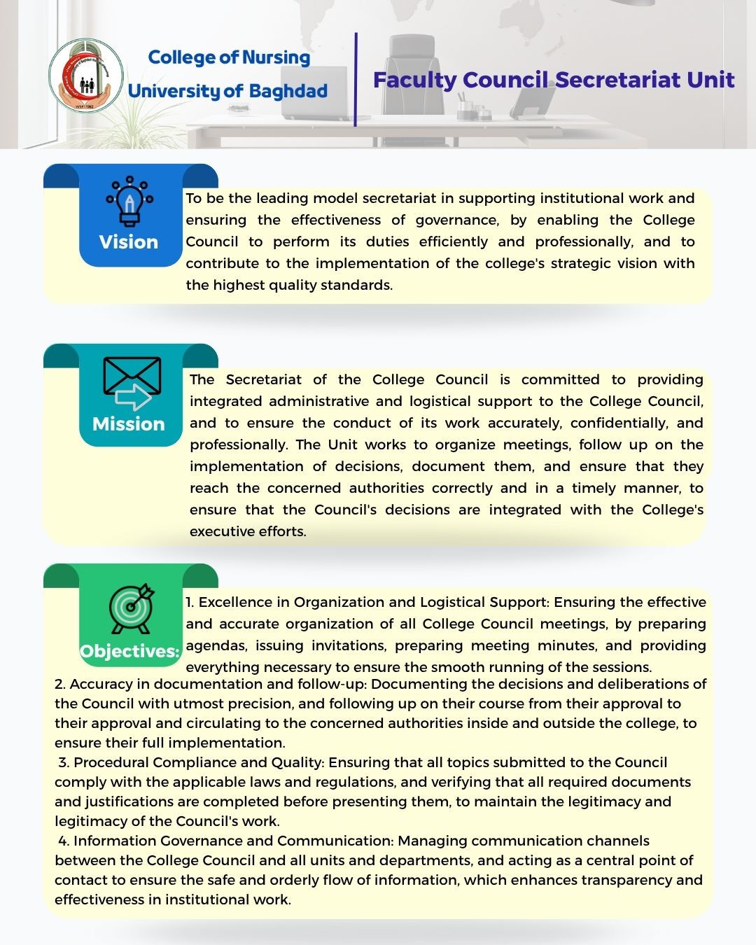 The College Council Secretariat is the body that deals with the meetings of the College Council (the highest scientific and administrative authority in the college, which consists of the Dean of the College, the heads of the scientific departments, the scientific and administrative assistants of the Dean, and the Secretary of the College Council) and is directly related to the Dean (Chairman of the College Council). The Secretary of the College Council is responsible for implementing and following up the decisions of the College Council until they reach the concerned authorities for their endorsement, and then supervising their redirection to the relevant authorities to implement the decisions, whether inside or outside the college. Accordingly, the College Council Secretariat is an executive department that facilitates the tasks of the College Council and provides all administrative and secretarial services for everything related to the work of the Council and is directly linked to the President of the College Council, His Excellency the Dean of the College.