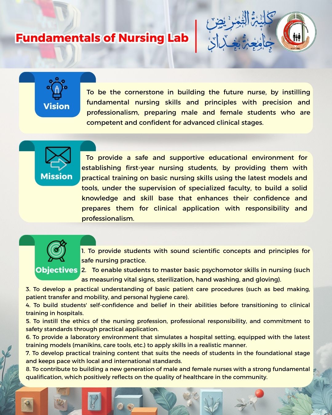 The Faculty of Nursing is one of the applied science faculties that relies heavily on practical laboratories to qualify and prepare students to acquire nursing skills before applying them in the field. Within hospitals and health institutions, the theoretical aspect is integrated with the practical aspect.