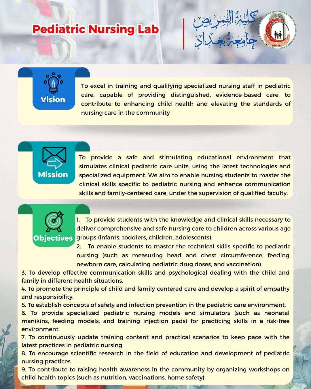 Enabling students to improve the quality of nursing performance and develop their practical skills. Prepare graduates with the scientific and practical skills required by the nursing profession. The pediatric nursing laboratory also works on the development of community health services through the organization of conferences and seminars aimed at raising awareness. seminars and workshops aimed at raising awareness of health issues among the Iraqi people. Iraqi community.